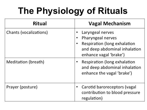 Contemplative practices are conceptualized as methods that function as neural exercises enhancing vagal regulation of the autonomic nervous system. The model presented proposes that specific voluntary behaviors (e.g., breath, vocalizations, and posture), which characterize ancient rituals and form the core of contemplative practices, can trigger a physiological state mediated by vagal pathways that fosters health and optimizes subjective experiences. The model emphasizes that, in order for the positive benefits of contemplative practices to be experienced, the rituals associated with contemplative practices (e.g., chants, prayers, meditation, and dance) must be performed in a context defined by physical features that are calming and soothing and promote feelings of safety.